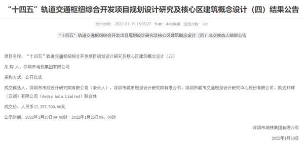 日前,經(jīng)深圳市地鐵集團有限公司官網(wǎng)中標(biāo)公示通過,公司軌道交通院作為聯(lián)合體牽頭方參投的“‘十四五’軌道交通樞紐綜合開發(fā)項目規(guī)劃設(shè)計研究及核心區(qū)建筑概念設(shè)計(四)”喜獲中標(biāo),中標(biāo)金額人民幣1700余萬元。