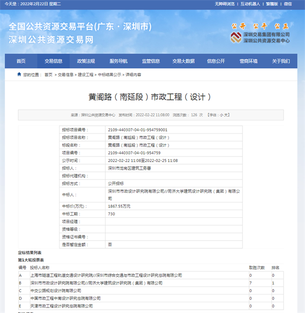 2022年2月22日,經(jīng)深圳市公共資源交易中心中標公示通過,深圳市政院與同濟大學建筑設計研究院(集團)有限公司(聯(lián)合體)在深圳市龍崗區(qū)建筑工務署黃閣路(南延段)市政工程(設計)項目公開招標中成功中標,中標金額為1867.55萬元。