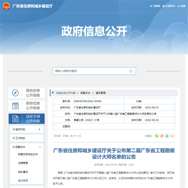 2022年8月30日,廣東省住房和城鄉(xiāng)建設(shè)廳網(wǎng)站發(fā)布第二屆廣東省工程勘察設(shè)計(jì)大師評選結(jié)果,公司總工程師徐波、首席專家靳守杰、特聘專家王建新榜上有名,獲評廣東省工程勘察設(shè)計(jì)大師。同時獲評3位廣東省工程勘察設(shè)計(jì)大師,體現(xiàn)了公司在尖端科技人才培養(yǎng)、專家團(tuán)隊(duì)建設(shè)的發(fā)展優(yōu)勢,標(biāo)志著公司在人才工程建設(shè)方面取得了階段性勝利,為企業(yè)技術(shù)創(chuàng)新、成果轉(zhuǎn)化、人才培養(yǎng)等方面提供了更廣闊的發(fā)展空間。