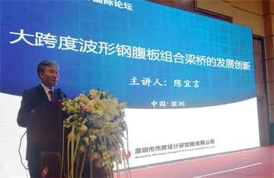 陳宜言董事長(zhǎng)在大會(huì)上做了題為《大跨度波形鋼腹板組合梁橋的發(fā)展創(chuàng)新》的主題演講。他首先介紹了中國(guó)橋梁建設(shè)已由橋梁大國(guó)向強(qiáng)國(guó)發(fā)展中所取得的成就,梳理了中國(guó)橋梁發(fā)展的脈絡(luò),還介紹了大跨度波形鋼腹板組合橋這一新型組合橋梁的特點(diǎn)和發(fā)展歷史,并詳細(xì)介紹我司對(duì)該類橋梁的設(shè)計(jì)和創(chuàng)新工作。他還指出,深圳市東寶河新安特大橋的結(jié)構(gòu)創(chuàng)新設(shè)計(jì),證明了我國(guó)大跨度波形鋼腹板組合箱梁橋的跨徑已經(jīng)取得巨大突破,當(dāng)前的設(shè)計(jì)和施工技術(shù)水平可以使該橋梁的主跨達(dá)到200m。伊朗德黑蘭北部高速BR-06特大橋的成功合龍,體現(xiàn)了大跨度波形鋼腹板組合箱梁橋在強(qiáng)地震烈度地區(qū)的推廣和使用價(jià)值。而在建中的合肥市南淝河特大橋,進(jìn)一步說明了波形鋼腹板組合箱梁橋可以滿足超寬城市橋梁的設(shè)計(jì)要求。該橋也是我國(guó)首次將耐候鋼大規(guī)模使用到大跨度波形鋼腹板組合箱梁橋上,為我國(guó)鋼混組合結(jié)構(gòu)橋梁的防腐和養(yǎng)護(hù)提出了新的解決方案。他認(rèn)為“中國(guó)制造2025”概念的提出,為我國(guó)由橋梁大國(guó)轉(zhuǎn)變成橋梁強(qiáng)國(guó)帶來了最佳契機(jī)。雖然我國(guó)橋梁工程設(shè)計(jì)、施工和科研方面都取得了一定成果,但仍需要持續(xù)提升我國(guó)橋梁建設(shè)創(chuàng)新能力和技術(shù)競(jìng)爭(zhēng)力,尤其在結(jié)構(gòu)分析和設(shè)計(jì)軟件國(guó)產(chǎn)化方面需下大力氣。大跨度波形鋼腹板組合梁橋,比起預(yù)應(yīng)力混凝土梁橋具有顯著的社會(huì)和經(jīng)濟(jì)效益,將在建設(shè)橋梁強(qiáng)國(guó)的過程中發(fā)揮重要作用。近十年來陳宜言董事長(zhǎng)對(duì)推動(dòng)我國(guó)大跨度波形鋼腹板組合箱梁發(fā)展所做出的貢獻(xiàn),得到了與會(huì)專家學(xué)者的贊賞,他對(duì)中國(guó)橋梁工程發(fā)展創(chuàng)新的觀點(diǎn)也得到大家認(rèn)同。