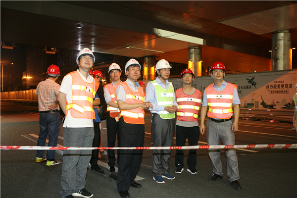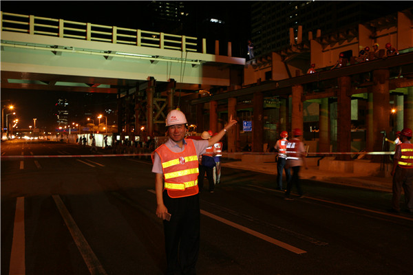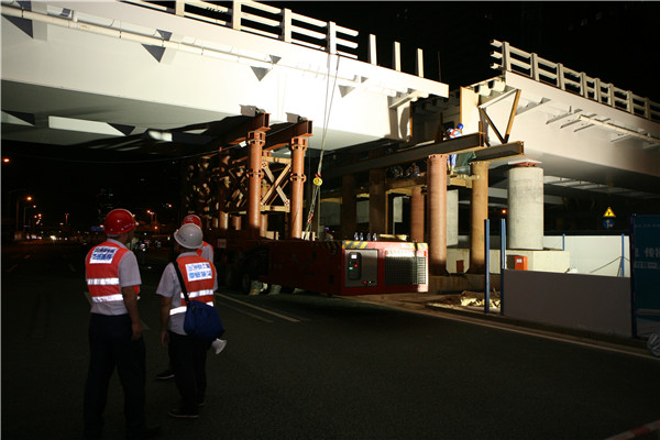 為保證架橋期間深南大道的交通連續(xù),施工采用夜間施工,選擇主線單邊雙向通行的交通疏解方案。采用SPMT模塊車架橋可以將傳統(tǒng)施工工藝7天的工期縮短為14小時(shí)左右,大大加快了整個(gè)架橋進(jìn)度,并且把對周邊環(huán)境和交通的影響降到了最低。橋梁架設(shè)期間,我公司副總經(jīng)理歐陽宇峰、橋梁總工王先前、市政四院副院長喬曉冉及項(xiàng)目組成員王延飛、孫志國等作為技術(shù)服務(wù)組全程提供技術(shù)支持。董事長陳宜言大師不辭辛苦,外地開會(huì)后晚間23:00趕回深圳,就直赴現(xiàn)場指導(dǎo)橋梁架設(shè)。