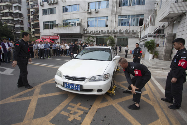 在緊張的滅火救援過程中,一名“恐怖分子”趁亂混進(jìn)停車場,抽出長刀對車輛亂砸亂砍,引起了現(xiàn)場的騷亂。保安員立刻抽調(diào)人手?jǐn)y帶防暴器械進(jìn)行阻止。面對窮兇極惡的“恐怖分子”,平時訓(xùn)練有素的保安員毫不畏懼,利用防暴盾、防暴鋼叉等器械對其進(jìn)行壓制,經(jīng)過一番周旋和搏斗后成功將其制服。
