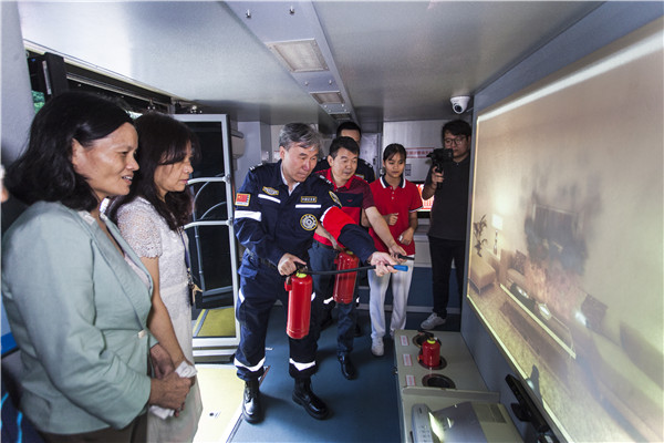 陳宜言董事長在消防宣傳車上體驗(yàn)家居滅火