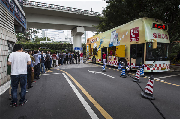 此次演習(xí),公司有幸邀請到福田公安消防大隊(duì)把流動課堂--消防宣傳車開到現(xiàn)場。醒目的消防宣傳車將消防宣傳的流動性、一體性有機(jī)地結(jié)合起來,麻雀雖小,五臟俱全。車輛內(nèi)部配備有大功率音響、無線話筒、消防宣傳滾動屏、多媒體播放顯示器等。同時,該車還配置了地鐵模擬體驗(yàn)系統(tǒng)、激光煙層逃生體驗(yàn)室、AR火災(zāi)預(yù)演態(tài)勢演練臺、VR識別家居安全隱患體驗(yàn)區(qū)、高層陽臺緩降系統(tǒng)等,特別是VR體驗(yàn)區(qū),大量運(yùn)用了電腦控制技術(shù),集宣傳、娛樂、體驗(yàn)為一體。滾動播放的消防宣傳片、公益廣告及火災(zāi)案例警示片、創(chuàng)新的體驗(yàn),為大家零距離普及宣傳消防知識。