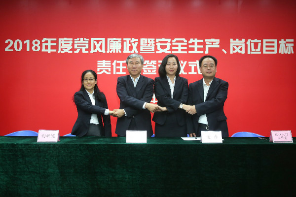 黨委書(shū)記、董事長(zhǎng)陳宜言與黨委副書(shū)記、總經(jīng)理蔡明和黨委副書(shū)記、紀(jì)委書(shū)記、工會(huì)主席郭明簽署責(zé)任書(shū)