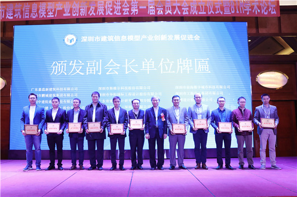 會(huì)議宣讀了促進(jìn)會(huì)第一屆理事會(huì)、監(jiān)事會(huì)成員名單。隨后,蔡瀛、高爾劍、王寶玉、黃強(qiáng)、陳宜言等領(lǐng)導(dǎo)嘉賓共同為促進(jìn)會(huì)揭牌,并向會(huì)長(zhǎng)單位深圳市市政設(shè)計(jì)研究院有限公司、監(jiān)事長(zhǎng)單位深圳蘭灣快鍵建筑科技有限公司和以廣東嘉蕊新建筑科技有限公司為代表的十一家副會(huì)長(zhǎng)單位頒發(fā)牌匾,為總顧問(wèn)黃強(qiáng)、秘書長(zhǎng)辛業(yè)洪、副秘書長(zhǎng)李良勝與浦至頒發(fā)聘書。大會(huì)還舉行了深圳市住房和建設(shè)局黃強(qiáng)BIM工作室簽約及揭牌儀式。