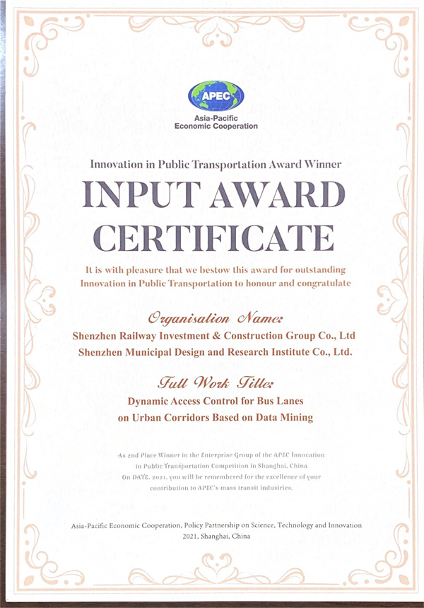 6月19日,亞太經(jīng)合組織(APEC)公共交通科技創(chuàng)新競(jìng)賽頒獎(jiǎng)儀式在上海舉行,深圳市政院作為技術(shù)支持單位提報(bào)的兩項(xiàng)參賽作品分別獲得賽事最高獎(jiǎng)項(xiàng)一等獎(jiǎng)和二等獎(jiǎng)。此次獲獎(jiǎng),是深圳市政院在企業(yè)機(jī)構(gòu)重組后面向公共交通科技創(chuàng)新領(lǐng)域取得的首個(gè)亞太區(qū)域成績(jī),也標(biāo)志著深圳市政院公共交通創(chuàng)新發(fā)展研究朝國(guó)際行業(yè)領(lǐng)先水平又邁進(jìn)了一步。