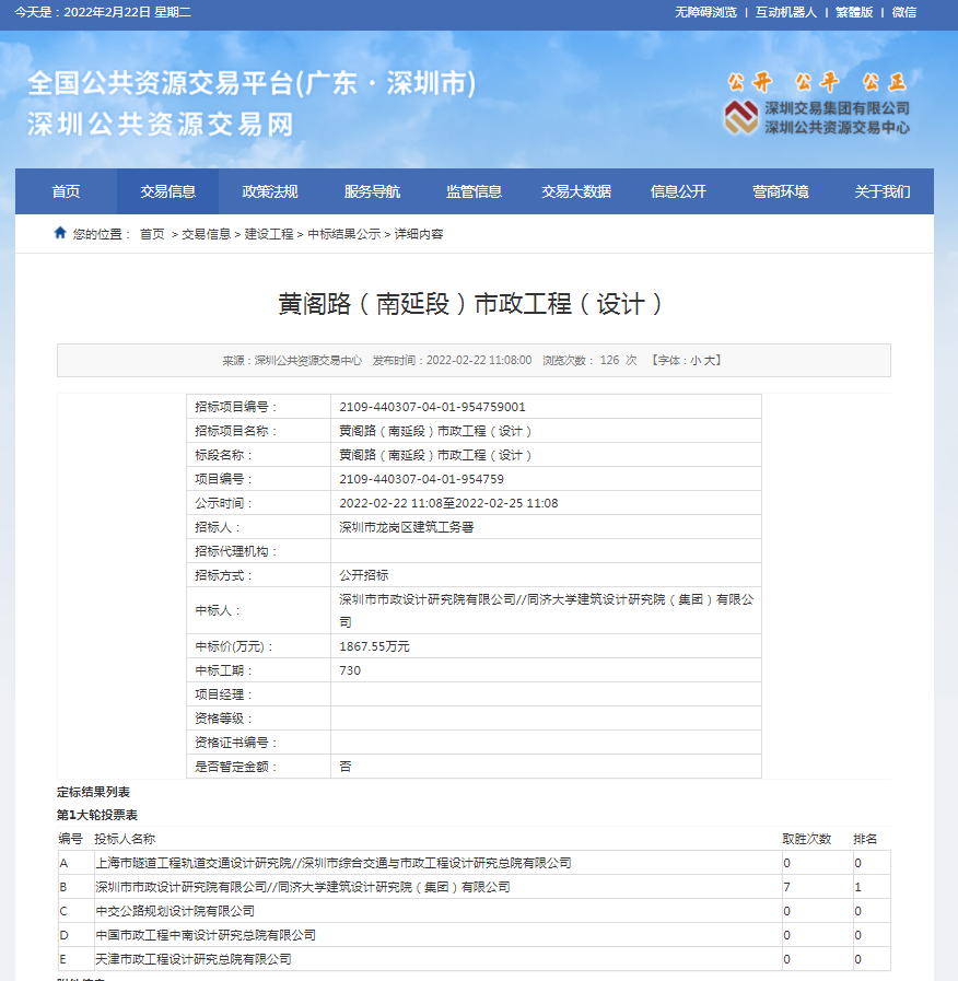 2022年2月22日,經(jīng)深圳市公共資源交易中心中標公示通過,深圳市政院與同濟大學建筑設計研究院(集團)有限公司(聯(lián)合體)在深圳市龍崗區(qū)建筑工務署黃閣路(南延段)市政工程(設計)項目公開招標中成...