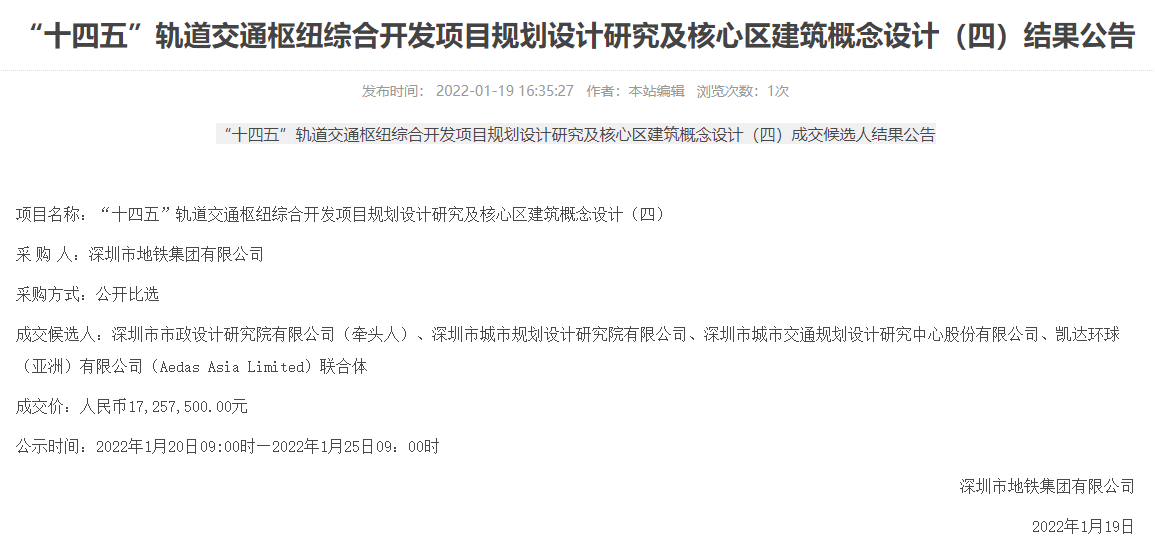 日前,經(jīng)深圳市地鐵集團有限公司官網(wǎng)中標公示通過,深圳市政院軌道交通院作為聯(lián)合體牽頭方參投的“‘十四五’軌道交通樞紐綜合開發(fā)項目規(guī)劃設計研究及核心區(qū)建筑概念設計(四)”喜獲中標,中標金額...